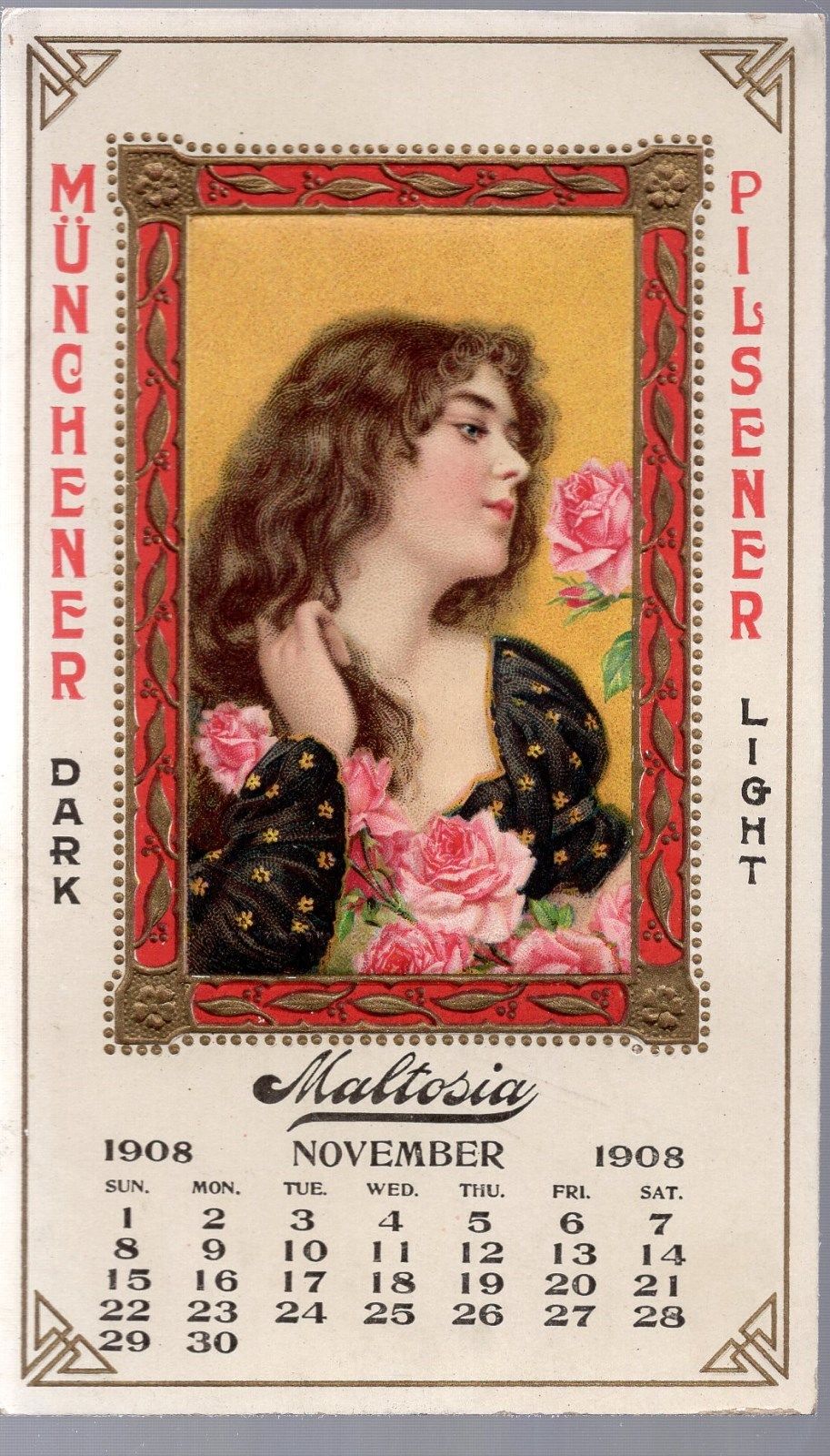 VINTAGE VICTORIAN TRADE CARD, MALTOSIA, NOVEMBER, 1908 BEER CALENDAR