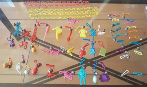 Title (ebay affiliate link): Vintage 1980s Toy Plastic Charms Bell Clip with 3 Necklaces & 27 charms