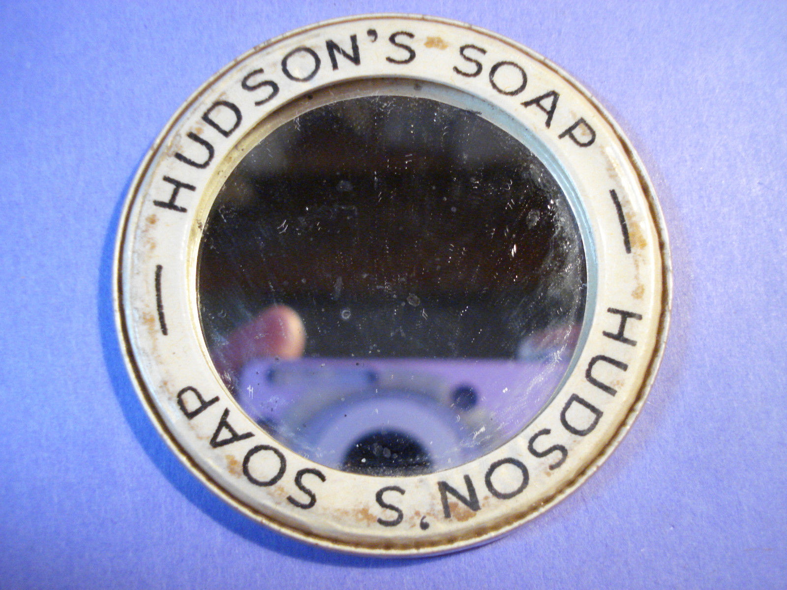 ANTIQUE ADVERTISING POCKET MIRROR CELLULOID USE HUDSON''S SOAP UNUSUAL BACK LOOK!