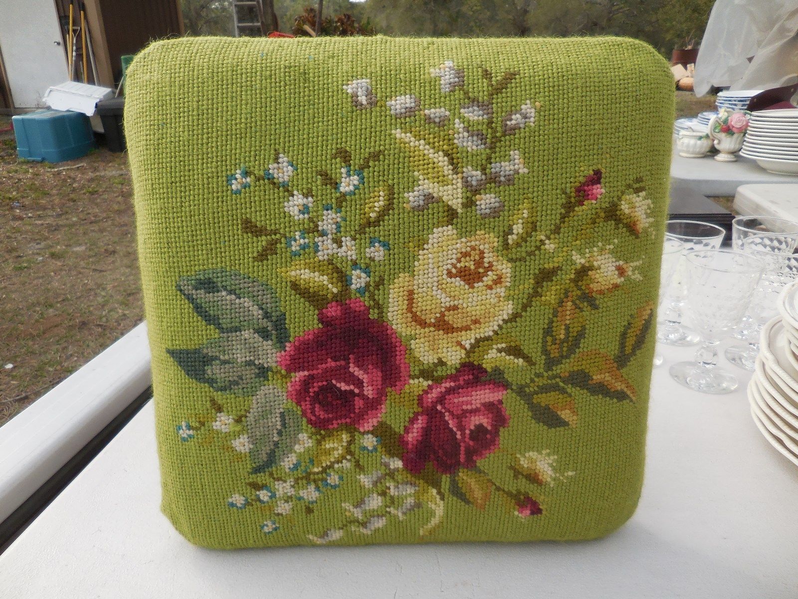 Title (ebay affiliate link): Vintage Shabby Cottage FLORAL ROSES Needle Point Foot Stool Footstool