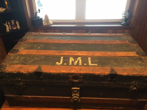 Antique Flat Top Wooden And Metal Steamer Trunk