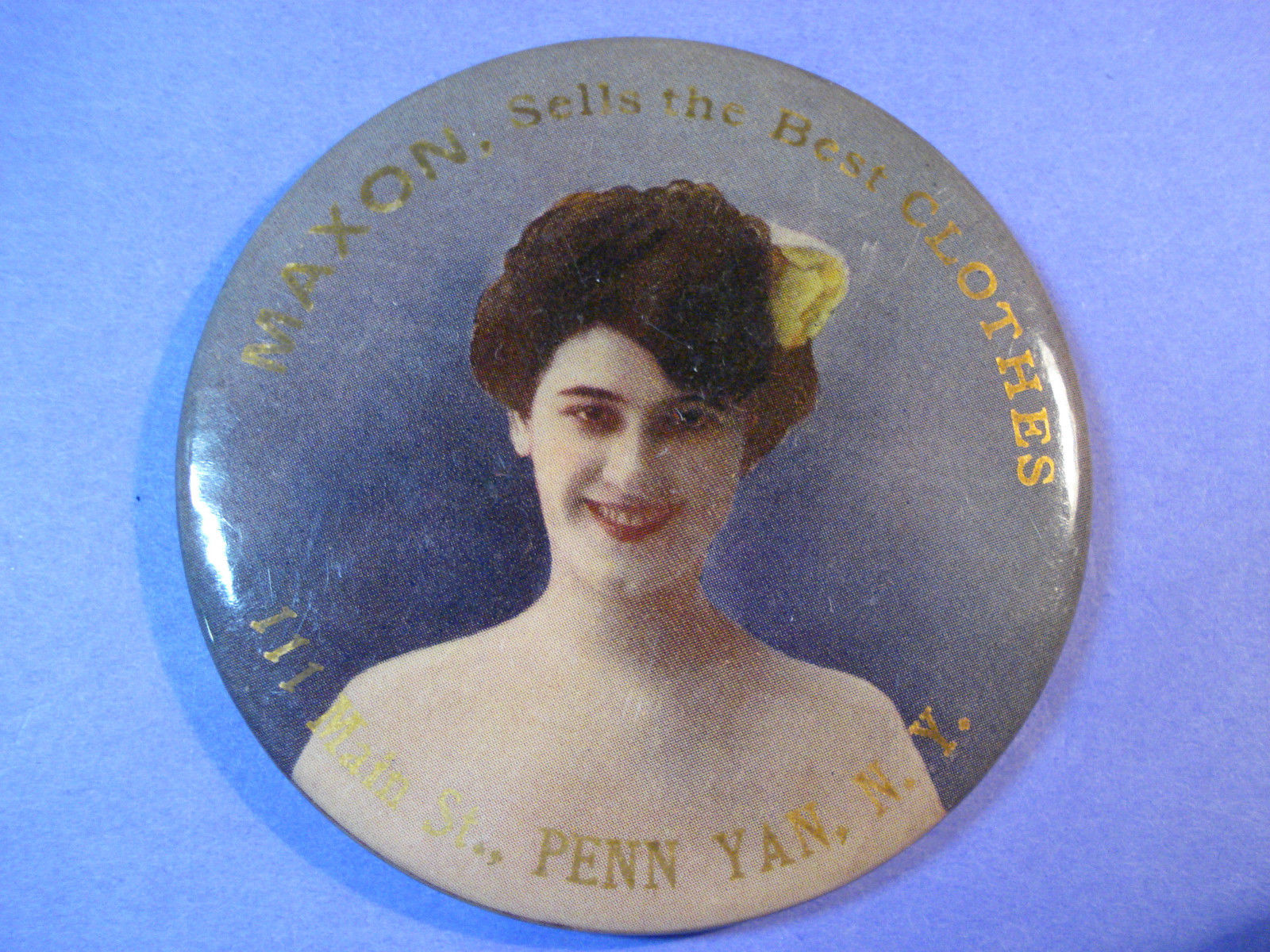 ANTIQUE ADVERTISING POCKET CELLULOID MAXON SELLS THE BEST CLOTHES PENN YAN, NY
