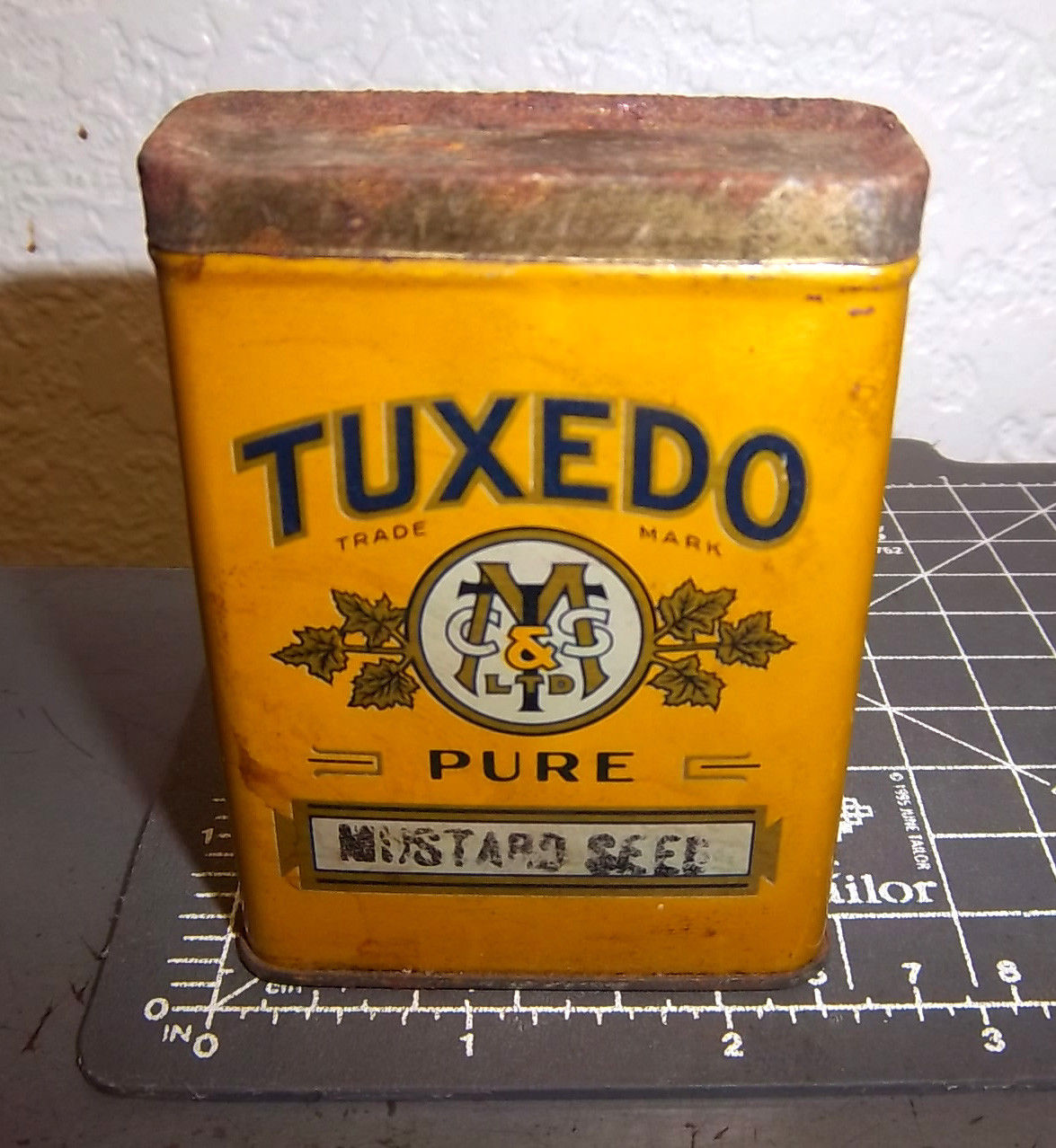 Title (ebay affiliate link): VINTAGE Tuxedo MUSTARD SEED Spice tin, great colors, Calgary Canada, full