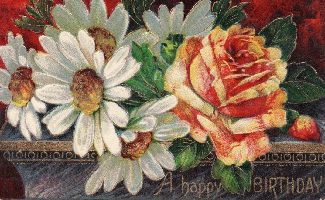 Title (ebay affiliate link): Large Yellow Rose with White Daisies Embossed Birthday Vintage Postcard