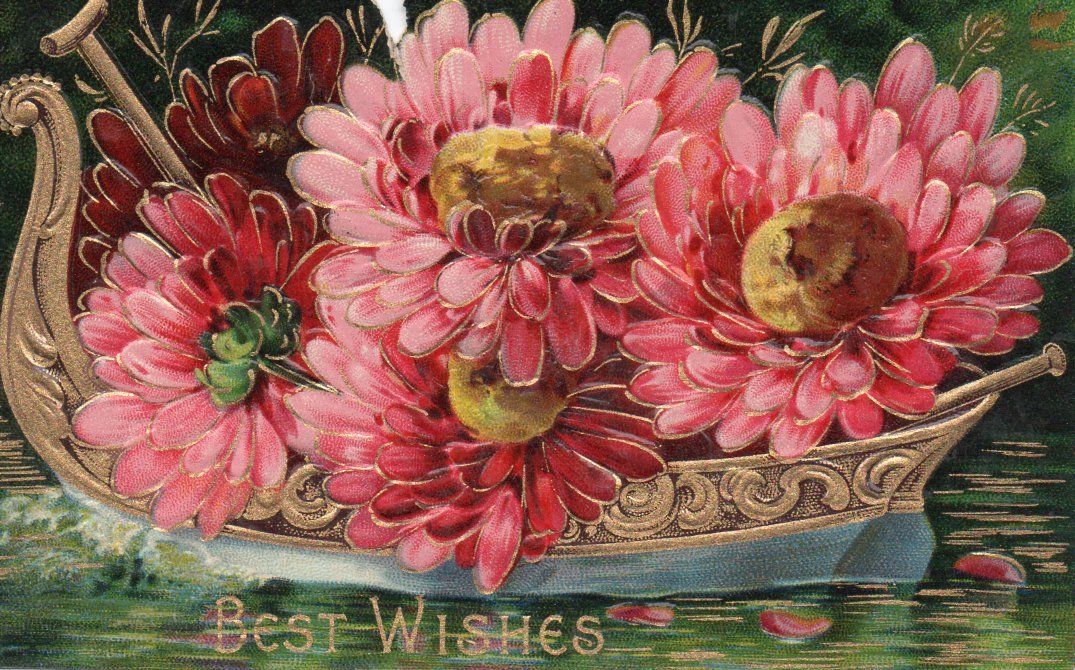 Title (ebay affiliate link): Bunch of Pink Mum Flower is a Gold Accented Boat Embossed Vintage Postcard