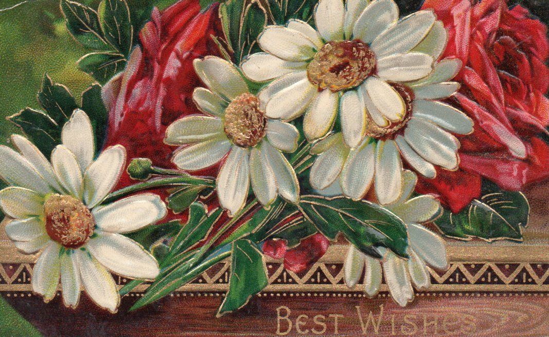 Title (ebay affiliate link): Red Roses with White Daisies on a Gold Etched Shelf Embossed Vintage Postcard
