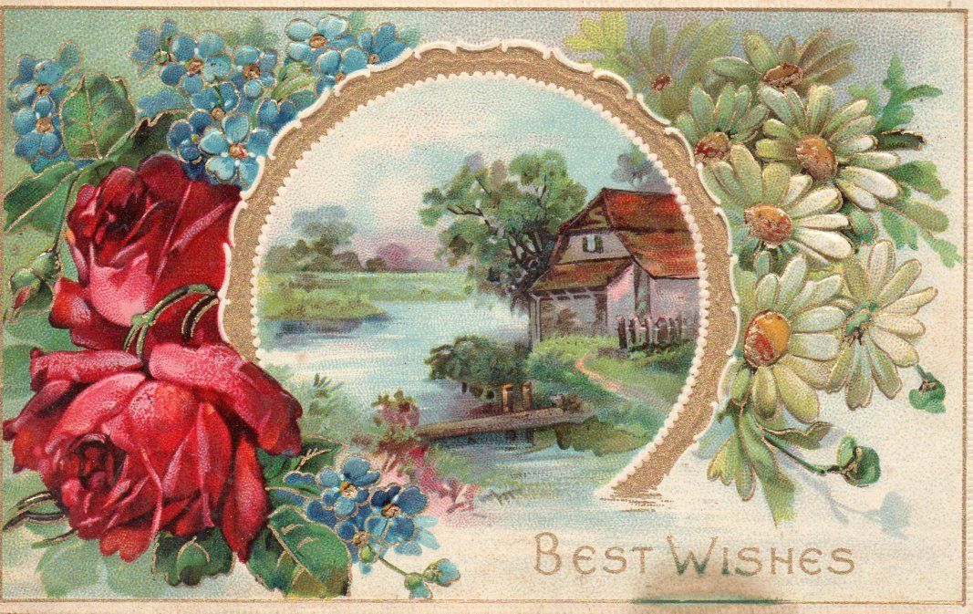 Title (ebay affiliate link): Cottage by River with Foot Bridge & Flowers Embossed Vintage Postcard