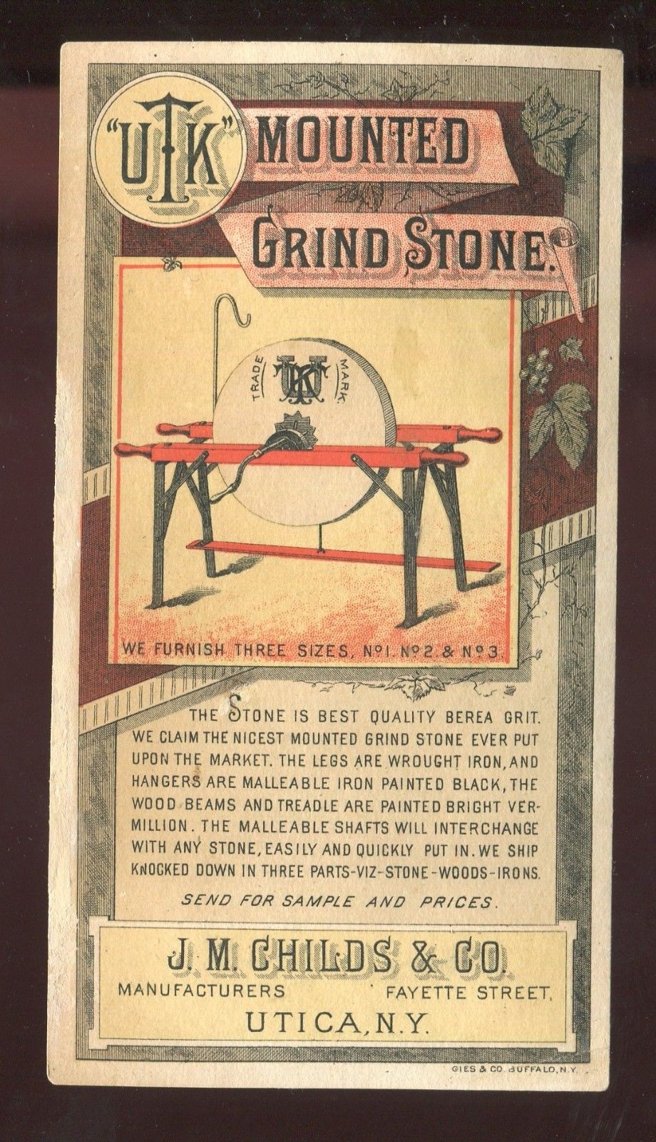 Utica NY JM Childs & Co UK Mounted Grind Stone Victorian Trade Card Awesome!!