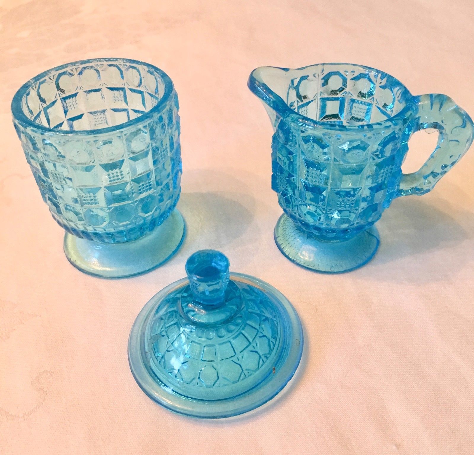 Title (ebay affiliate link): Aqua Blue Sugar Creamer Set - Kemple - Rare - Vintage Depression Cut Glass