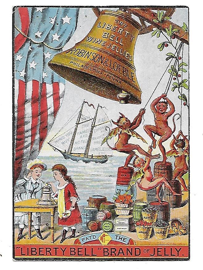 Title (ebay affiliate link): 1880S VICTORIAN TRADE CARD DEVILS RING LIBERTY BELL - BRAND JELLY GLASS BANK