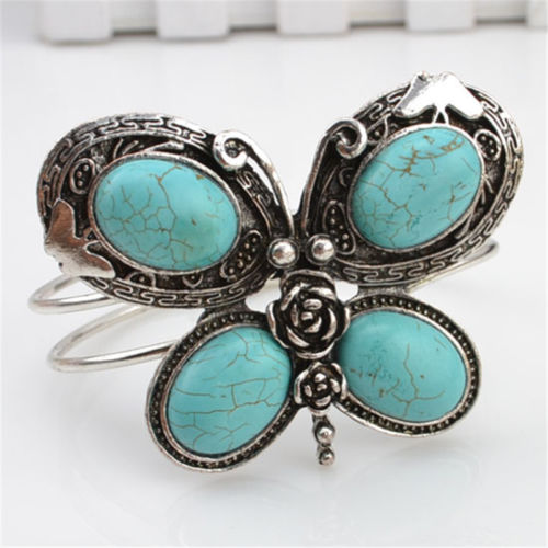 Vintage Women Jewelry Antique Silver Plated Turquoise Butterfly Bangle Bracelets