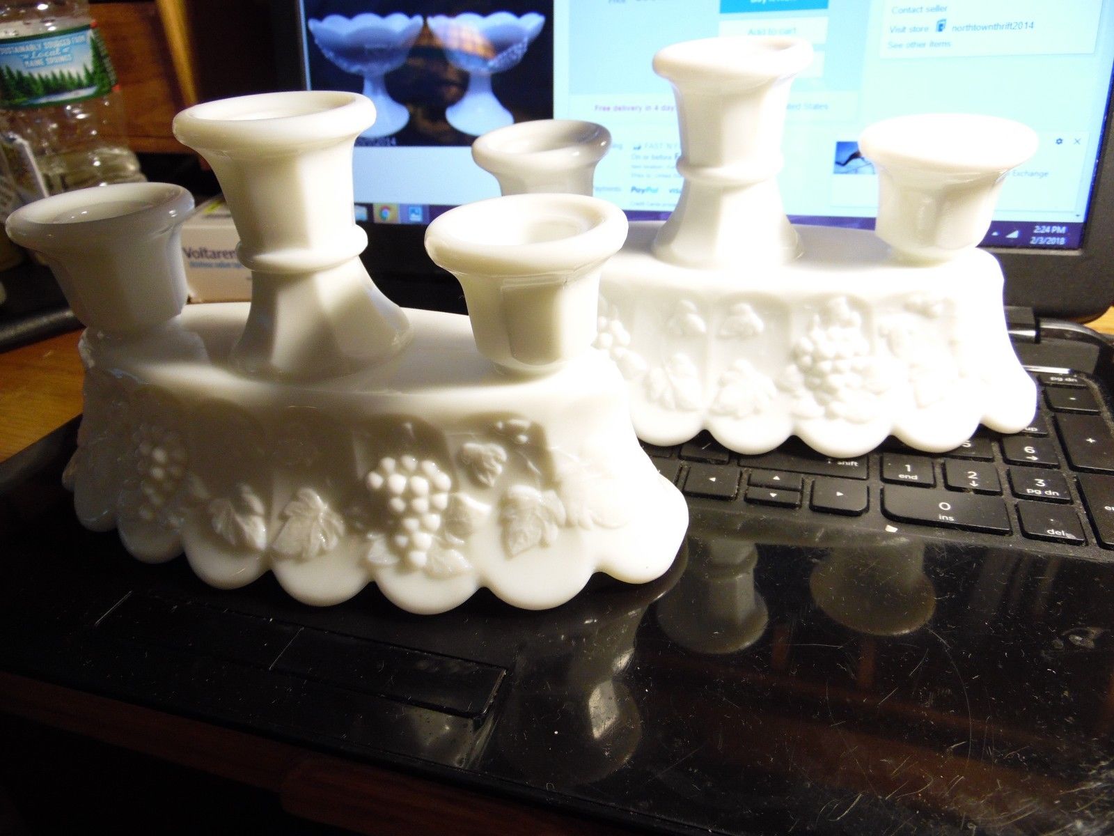 Title (ebay affiliate link): Lot of 2 VINTAGE Milk Glass Triple Candle Holders w/Grape Pattern 8" Wide