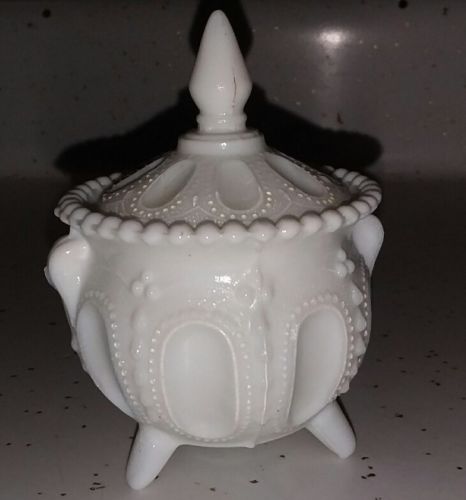 Title (ebay affiliate link): 3 inch round Fenton Milk Glass footed trinket box with lid