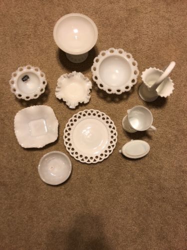 Title (ebay affiliate link): 10 piece milk glass variety some fenton hobnnail, candy dishes, jewelry box