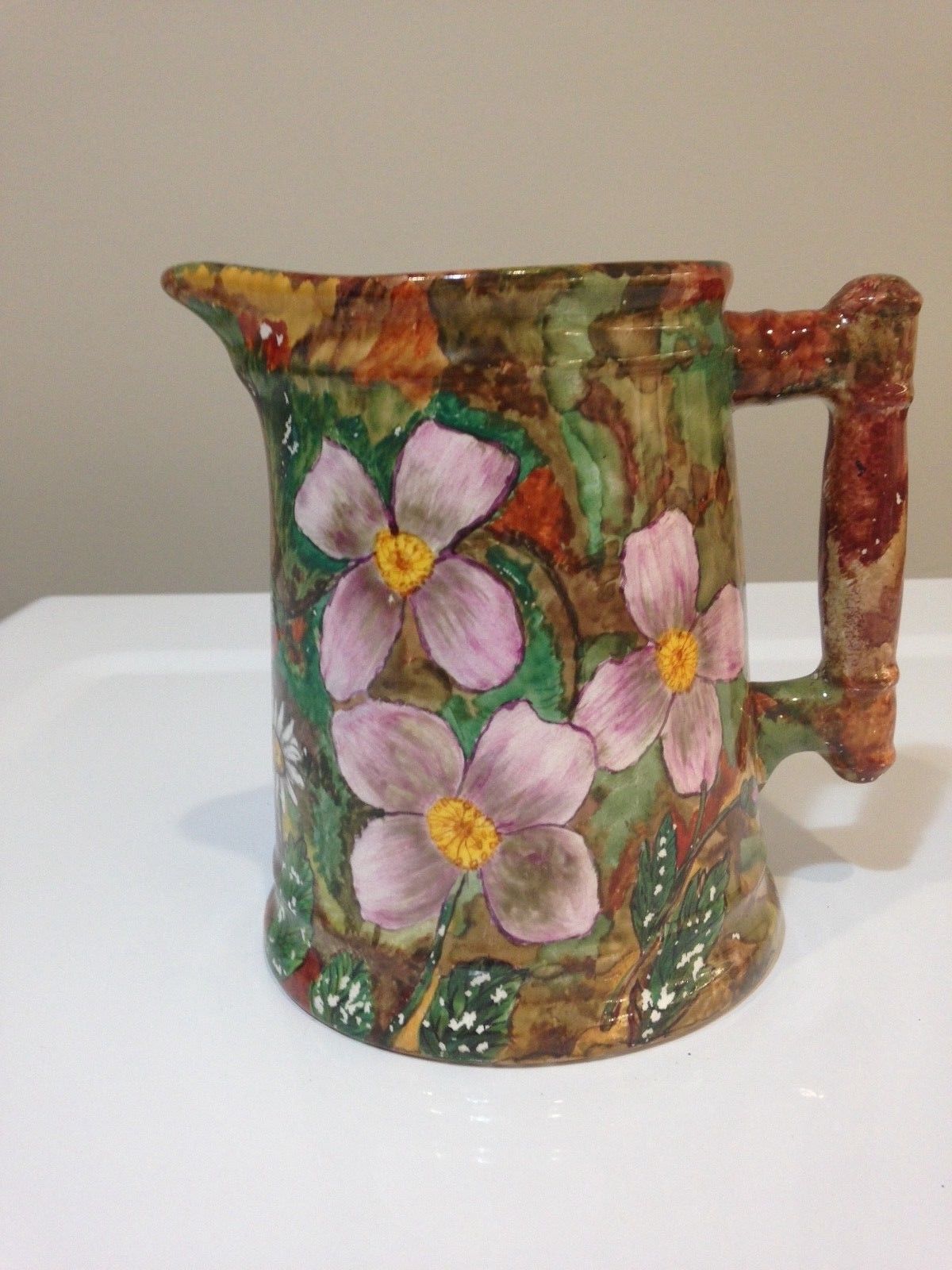 Extremely Old Painted Floral 6 1/2" TallPitcher Soft Green Inside