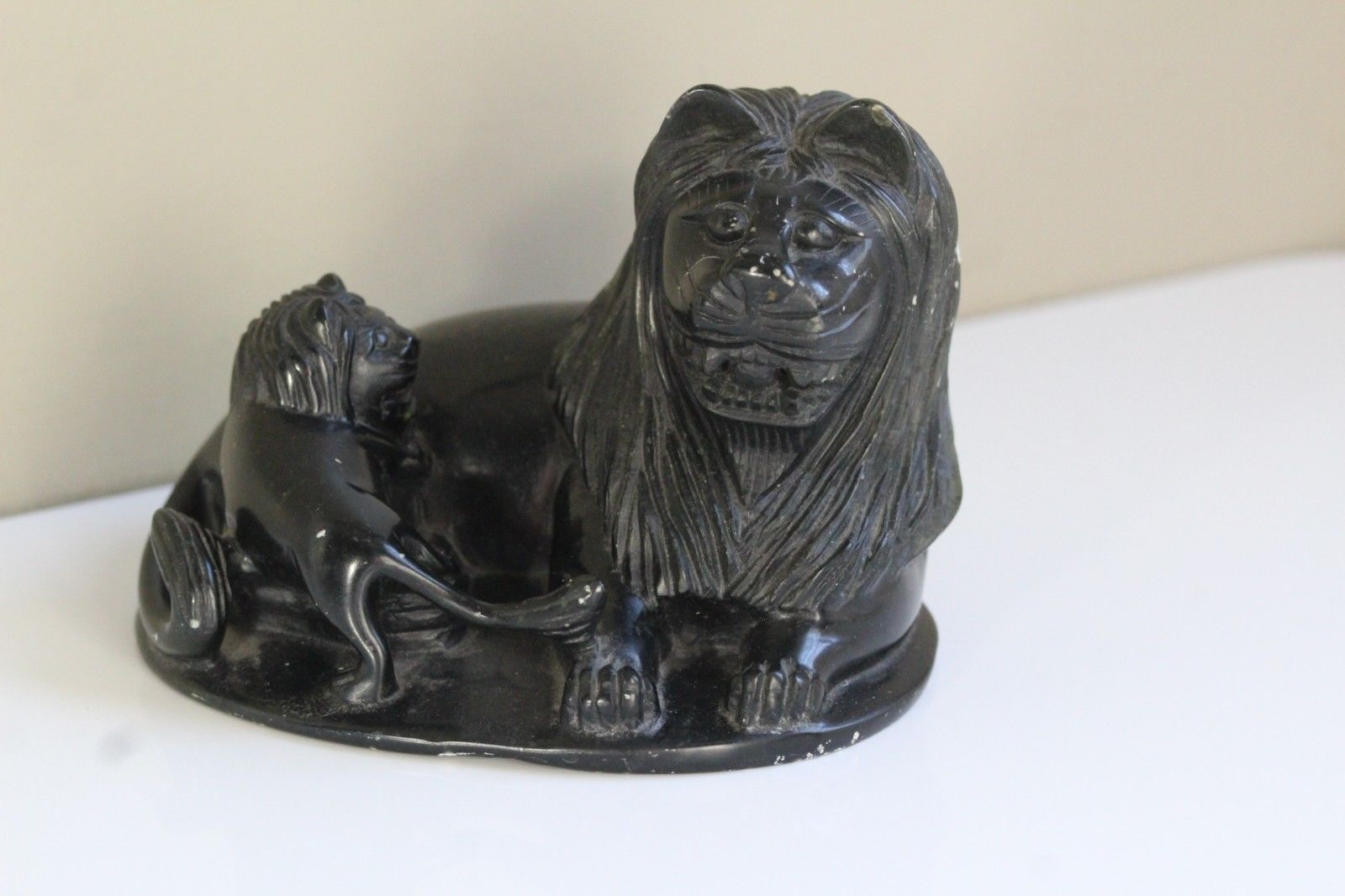 Antique 19thC Lion & Cub Carved Black Stone Statue Carving