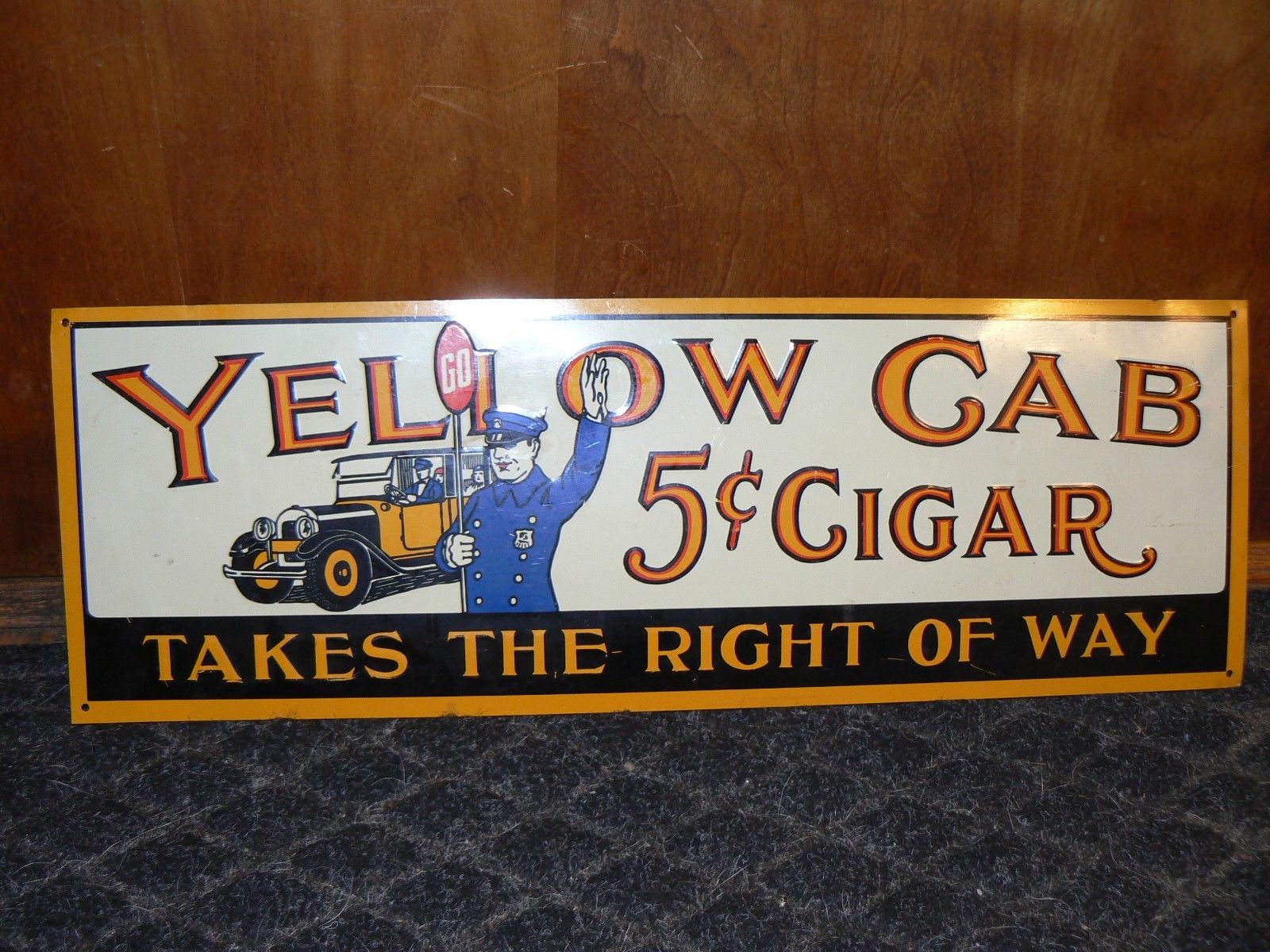 VINTAGE YELLOW CAB CIGAR EMBOSSED METAL SIGN BRIGHT /NR