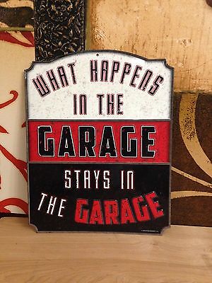 WHAT HAPPENS GARAGE HEAVILY EMBOSSED METAL SIGNN WALL DISPLAY SHOP MAN CAVE