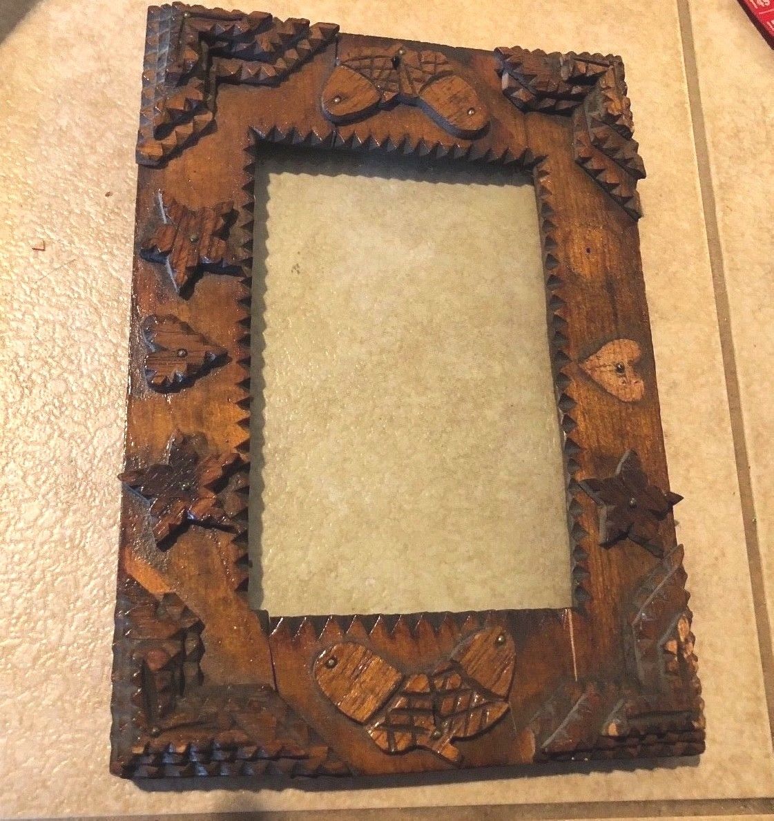 UNIQUE ANTIQUE TRAMP ART FRAME-ACORNS -STARS & HEARTS- FOR PARTS?