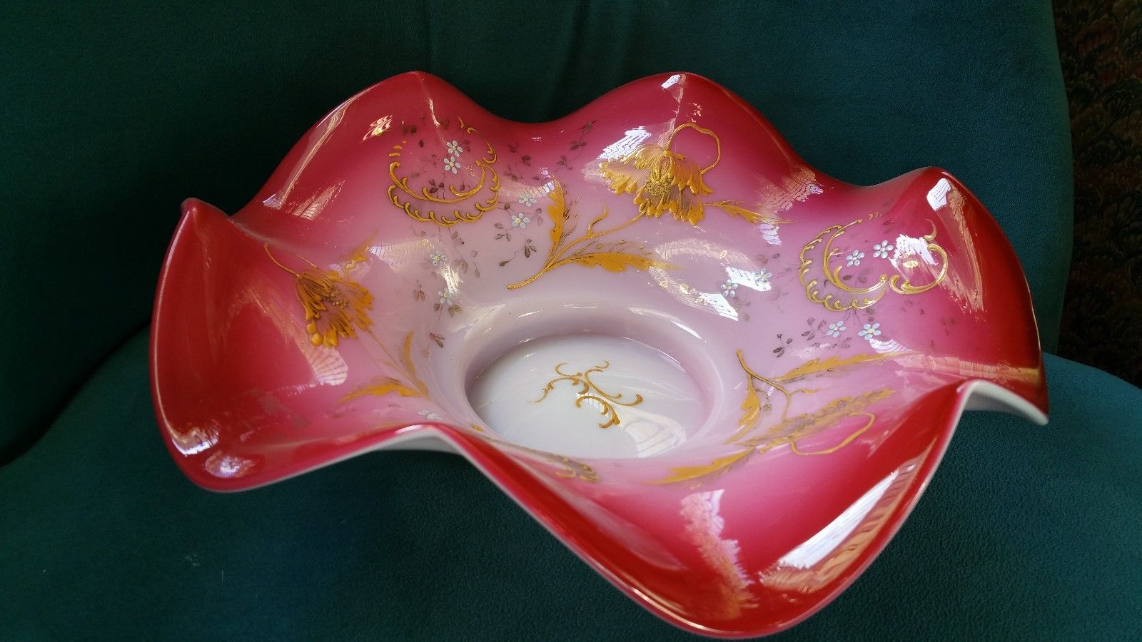 Title (ebay affiliate link): ANTIQUE VICTORIAN ART GLASS RUBINA VERDE BRIDES BOWL BASKET HAND PAINTED GOLD