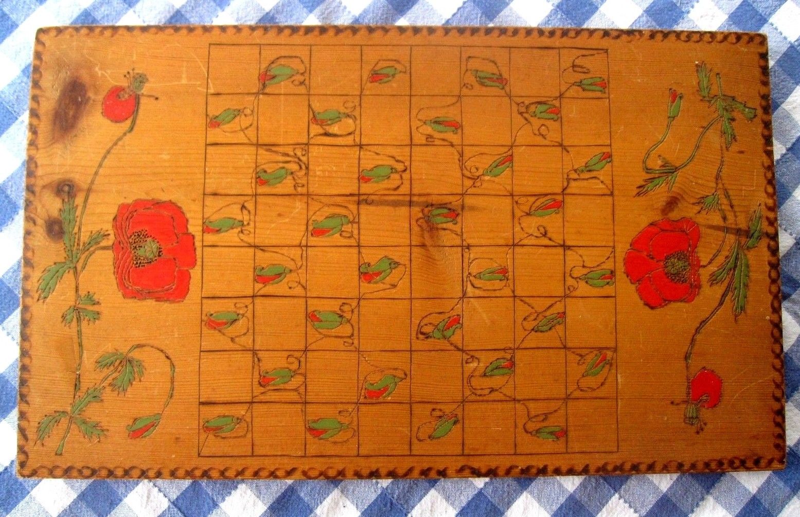 Title (ebay affiliate link): VINTAGE FLEMISH STYLE / FOLK ART BURNT WOOD GAME BOARD OR TRAY SIGNED