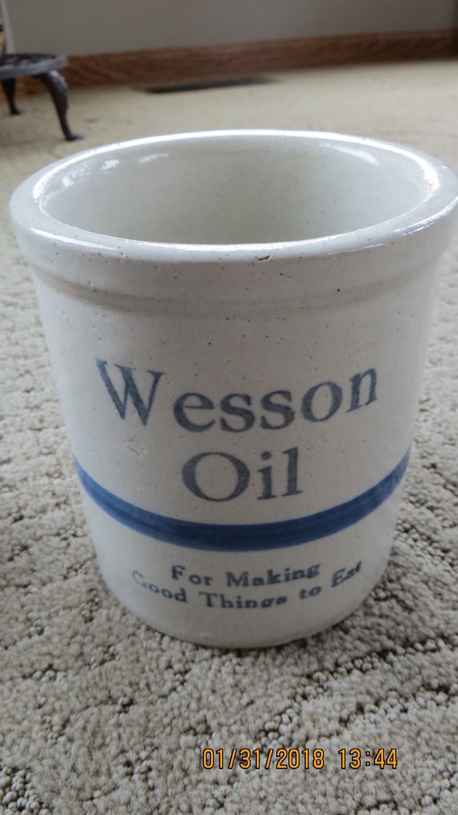 Title (ebay affiliate link): Antique Vintage Wesson Oil Stoneware Advertising Beater Jar Utensil Crock Blue