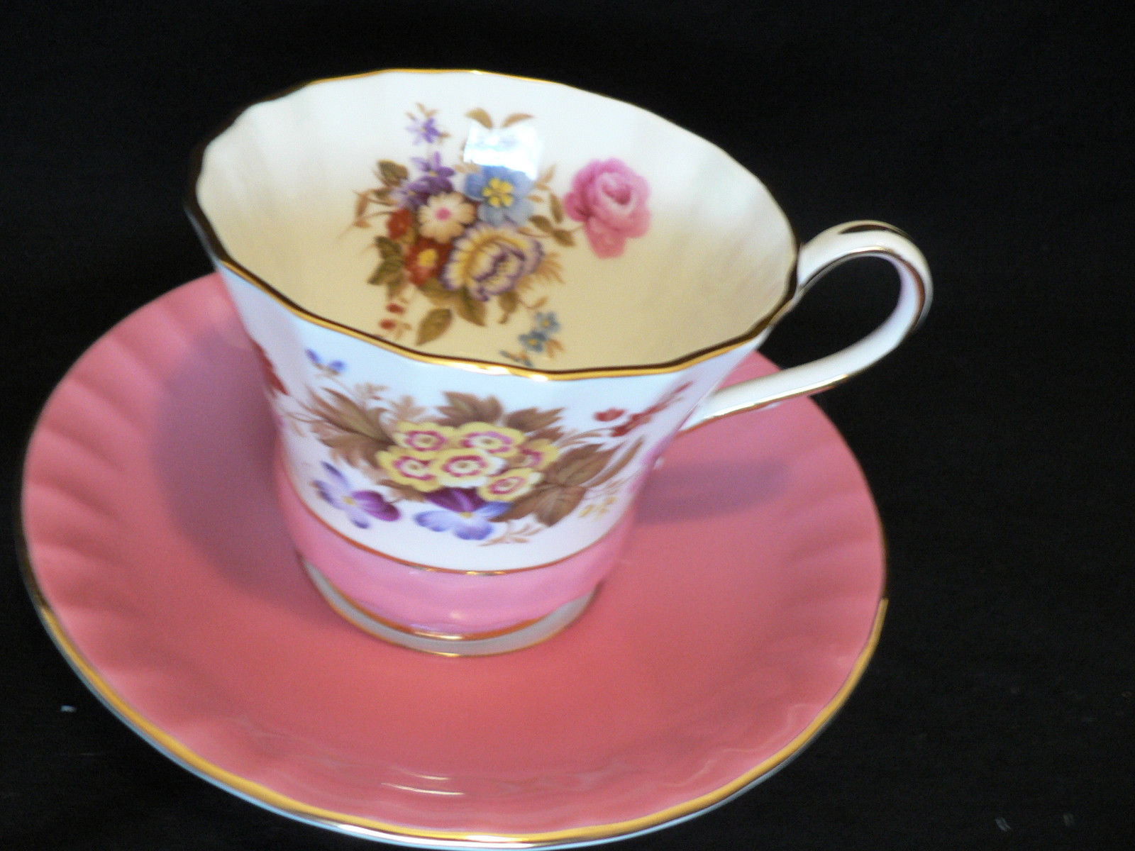 Title (ebay affiliate link): AYNSLEY TEA CUP AND SAUCER FLORAL ON WHITE AND PINK GOLD TRIM PINK SAUCER