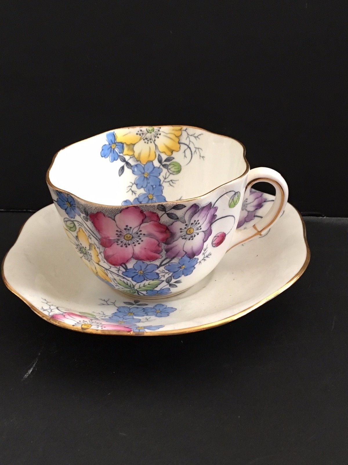 Vintage Taylor & Kent Bone China Tea Cup & Saucer - Floral/Gold- Longton England