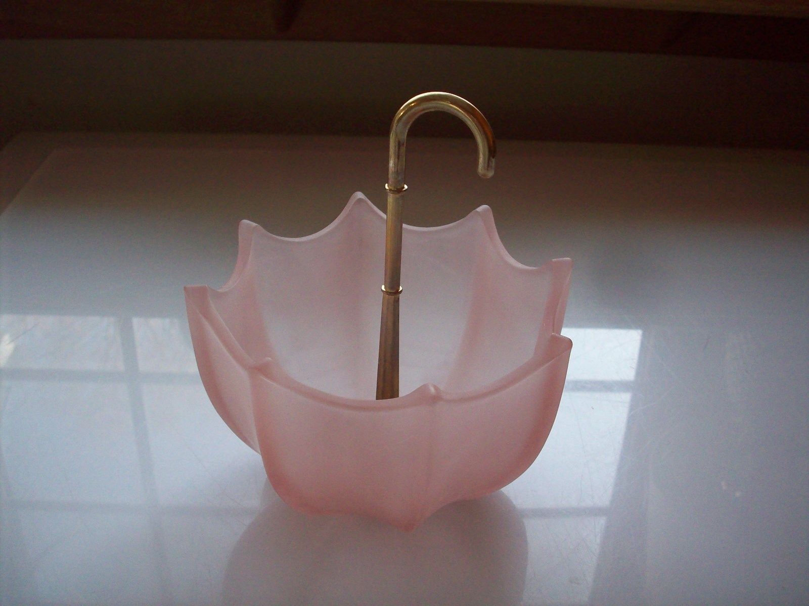 Title (ebay affiliate link): Pink Frosted Depression Glass Umbrella Bowl/Dish with Goldtone Handle