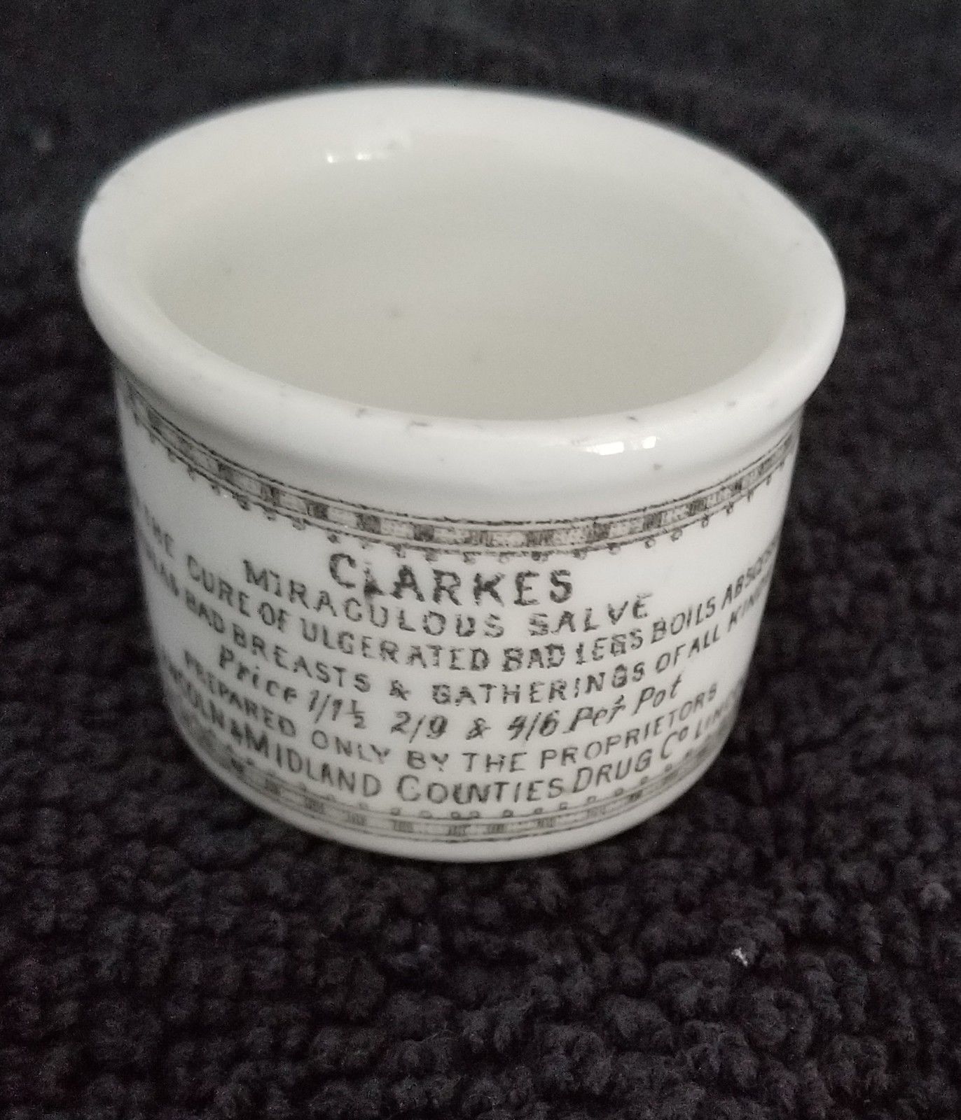 London 1880''s Clarks Miraculous Salve Ceramic Salve Pot