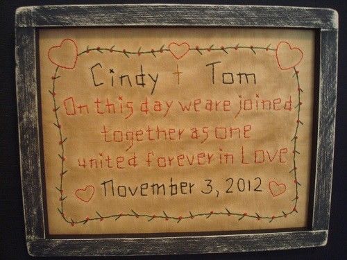 Title (ebay affiliate link): Primitive ~WEDDING SAMPLER~ Stitchery in black frame 12" x 9 1/2"