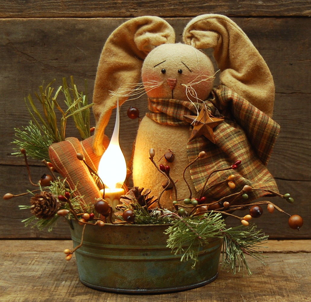 Title (ebay affiliate link): HANDMADE PRIMITIVE SPRING BUNNY RABBIT DOLL CARROTS CANDLE LAMP LIGHT