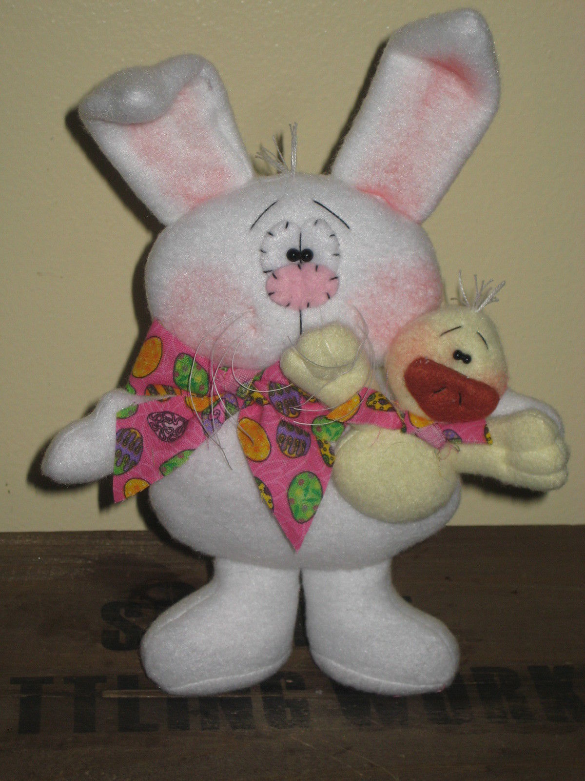 Title (ebay affiliate link): PRIMITIVE HC STANDING EASTER BUNNY RABBIT W/ CHICK SHELF SITTER ORNIE