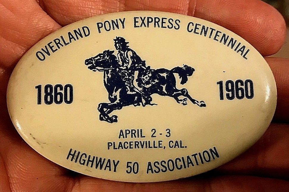 Title (ebay affiliate link): BUTTON - HIGHWAY 50 - 1960 - PLACERVILLE - CA - OVERLAND PONY EXPRESS CENTENNIAL