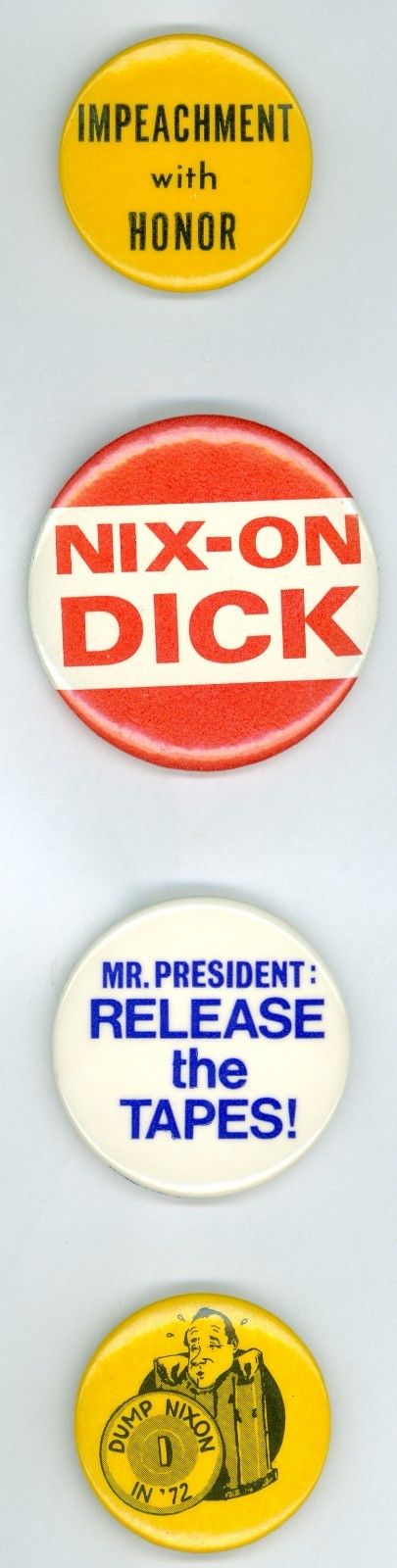 Title (ebay affiliate link): 4 Vintage 1970s Watergate Richard Nixon Social Cause Pinback Buttons Impeachment