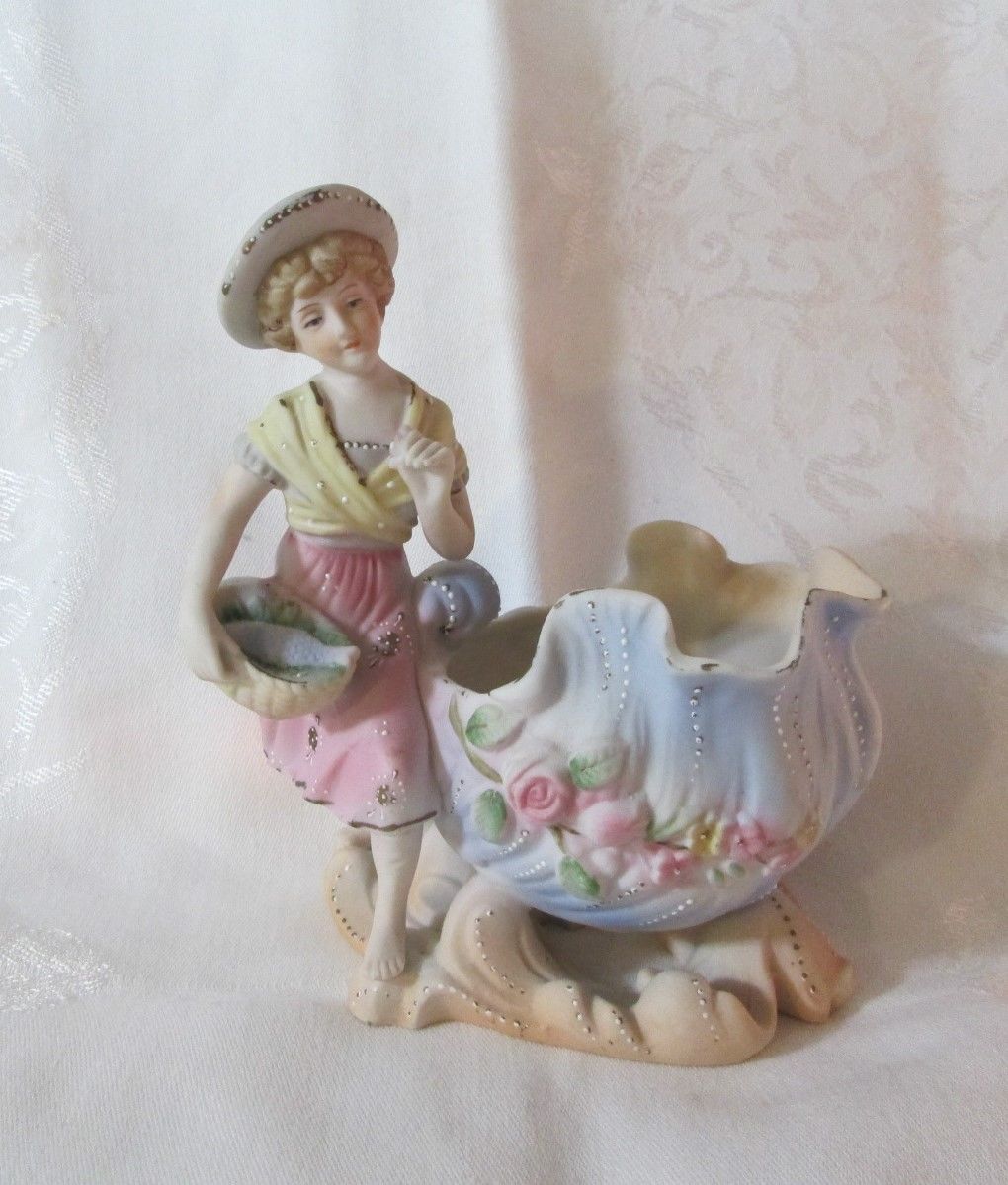 Beautiful Vintage Girl & Fish Basket Figurine Planter