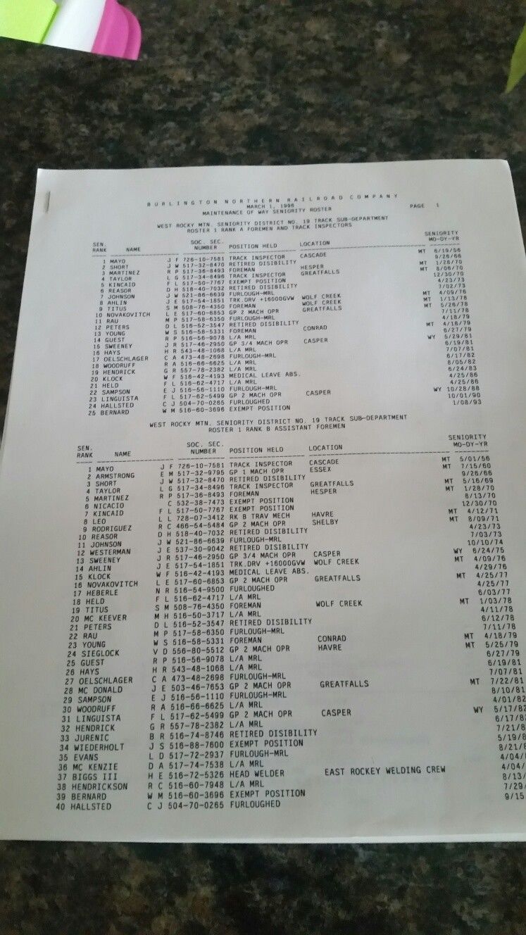 Title (ebay affiliate link): Burlington Northern Railroad Company 1996 Maintenance of Way Seniority Roster
