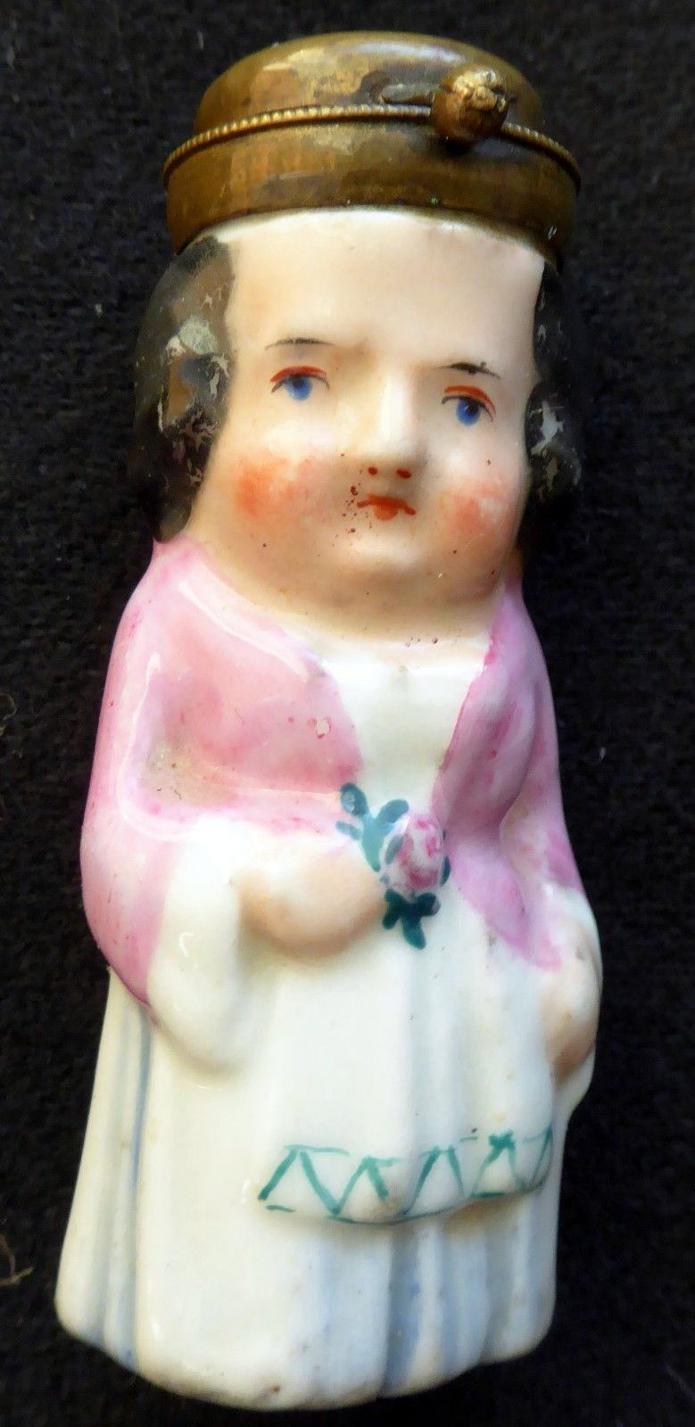 Antique 1800''s Woman Shape Figure Ceramic & Brass Staffordshire Perfume Bottle