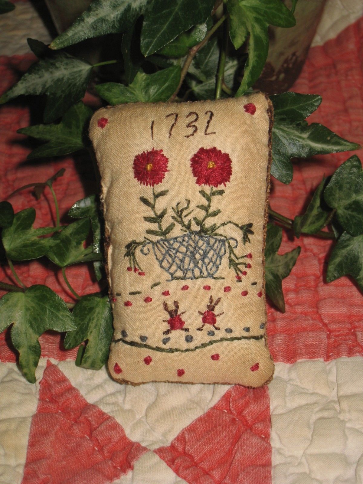 Title (ebay affiliate link): Primitive tiny Sampler Pillow *1732 Old Blue Basket of Flowers & 2 LiL Rabbits