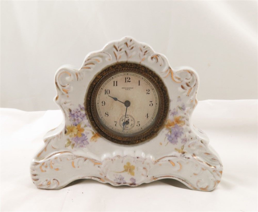 Title (ebay affiliate link): Antique Porcelain Purple & Yellow Flower Gold Gilt New Haven Mantel Clock 4 1/2"