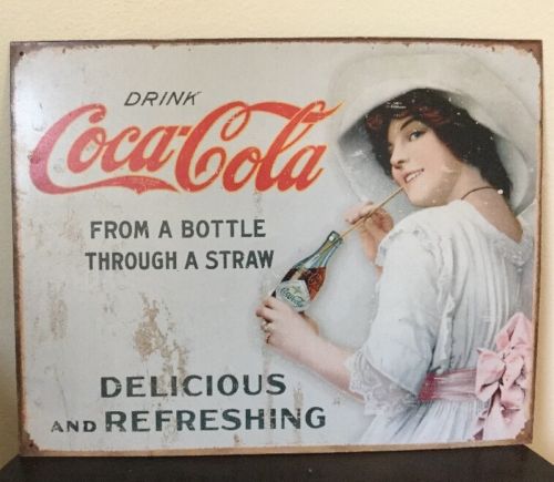 Title (ebay affiliate link): Coca Cola Bottle Through A Straw Tin Sign Soda Bottle White Dress Fountain Coke
