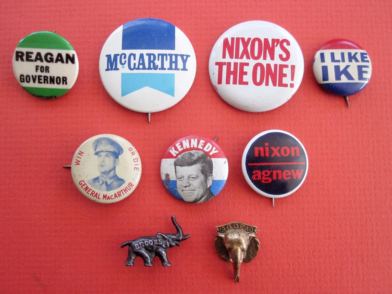 Title (ebay affiliate link): Vintage Set of 9 Political Candidates Pins, Brooks, Nixon/Agnew, Kennedy, Ike...