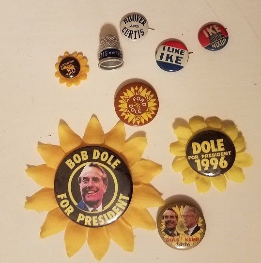 Title (ebay affiliate link): Large Dole Sunflower Pin- Kansas Presidential Candidates, 1996 Debate Souvenir