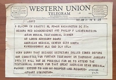 Title (ebay affiliate link): Telegram to Red Schoendienst - Stan Musial Dinner From Senator Stuart Symington