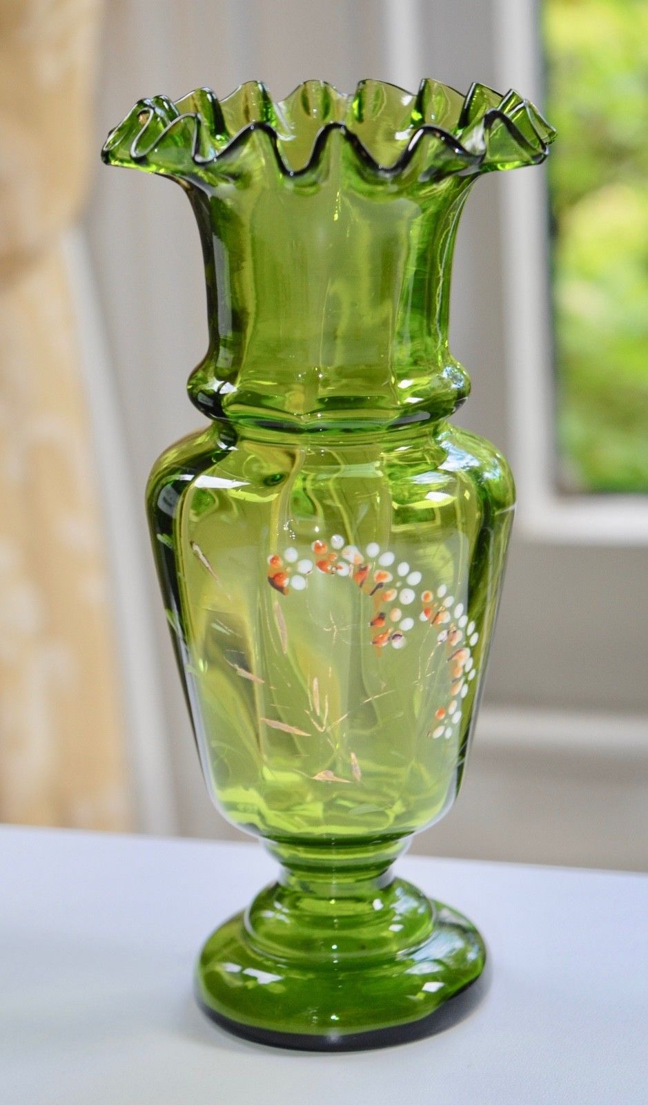 Title (ebay affiliate link): Antique Victorian Green Glass Vase - Ruffle, Hand Enamel Decoration 15.9cm