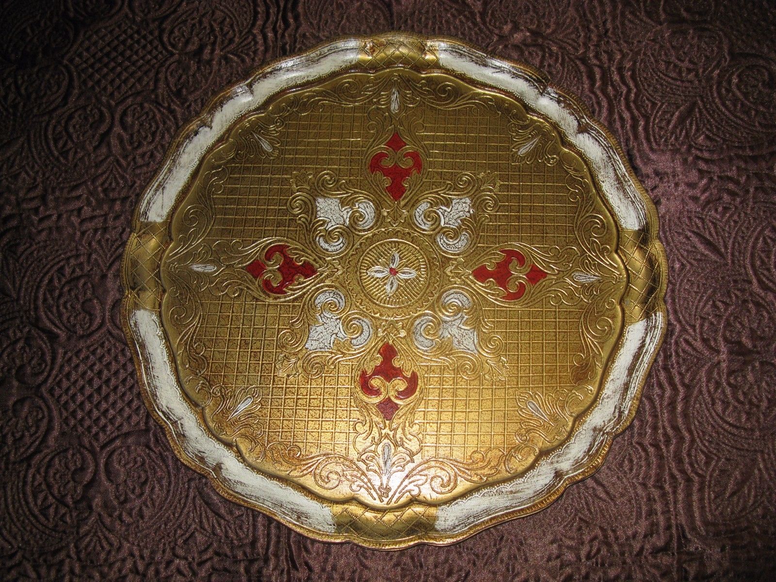 Title (ebay affiliate link): Florentine Italy Gold Red White Round Tole Tray Hollywood Regency Paris Apt 15"