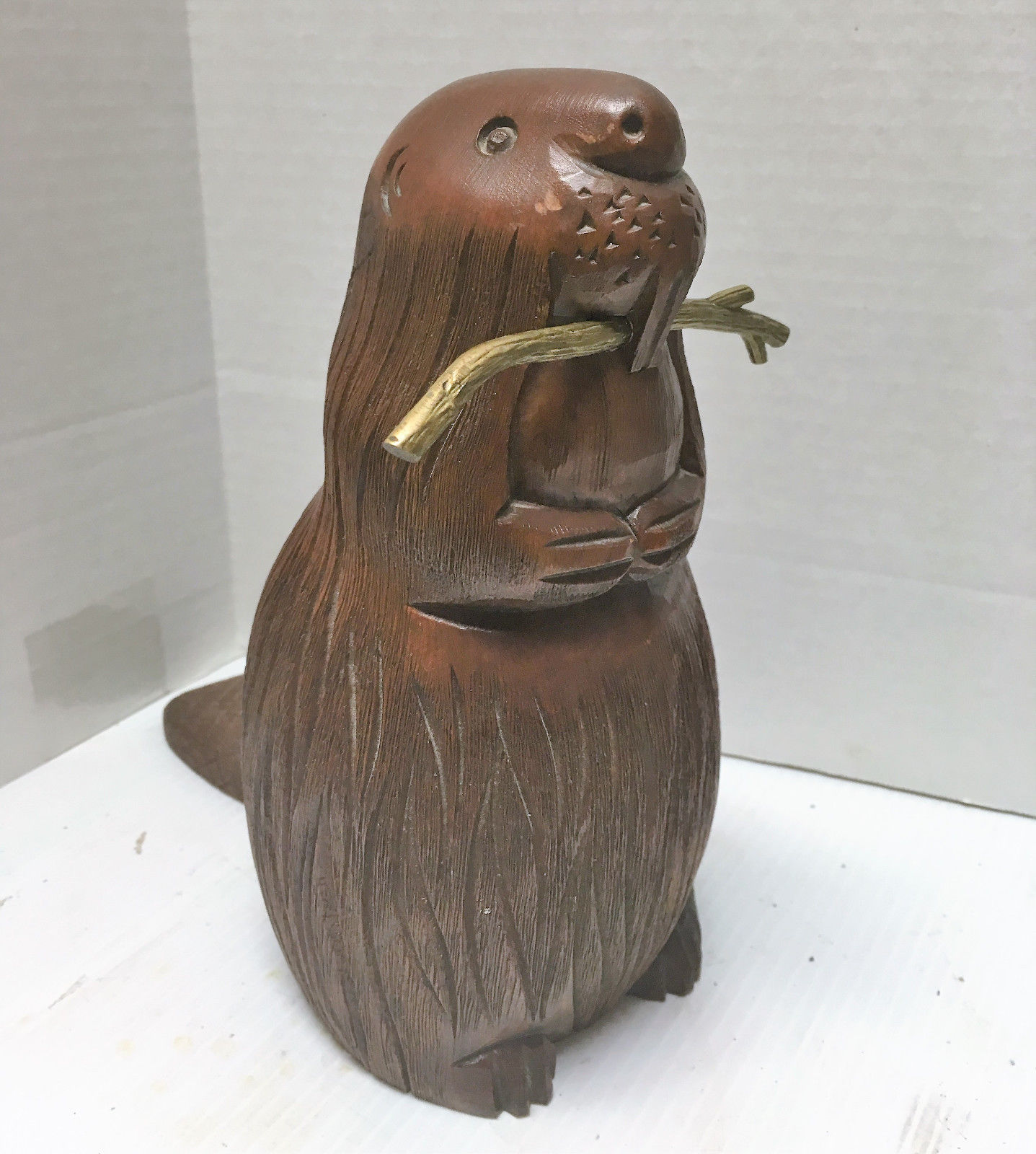 Vintage Sarreid Ltd. Wooden Carved Beaver Figure with Brass twig