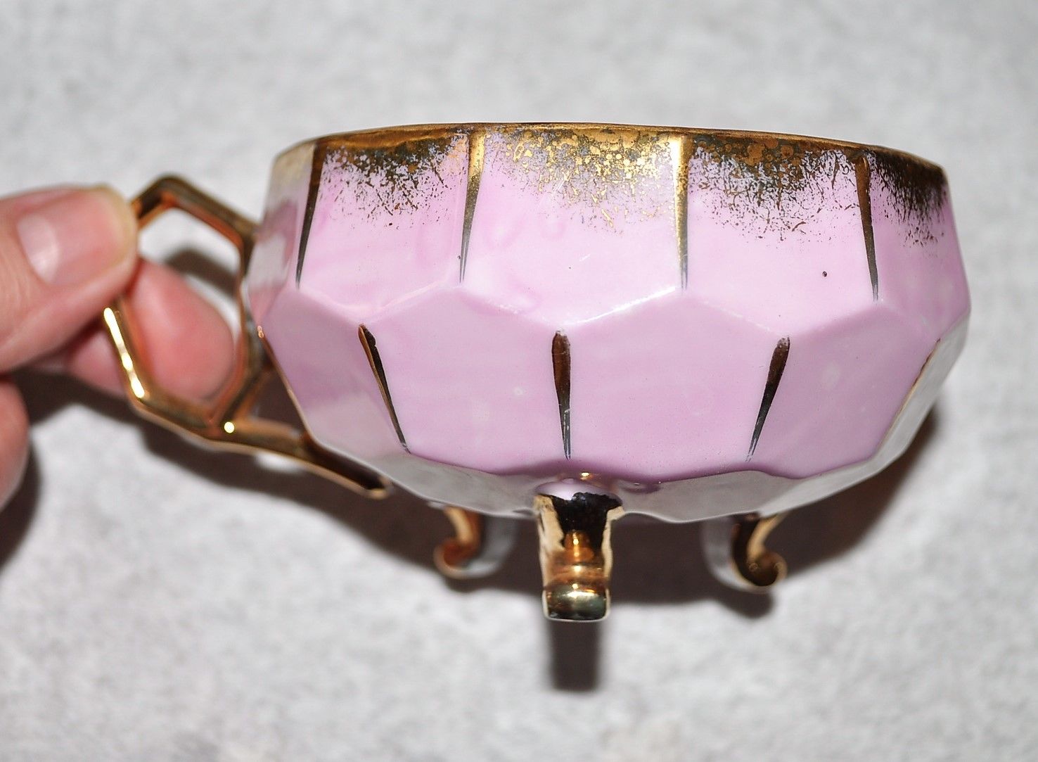 Title (ebay affiliate link): Delicate Bone China Hand Painted Retro Tea Cup In Pink & Gold Leaf footed 1950''s