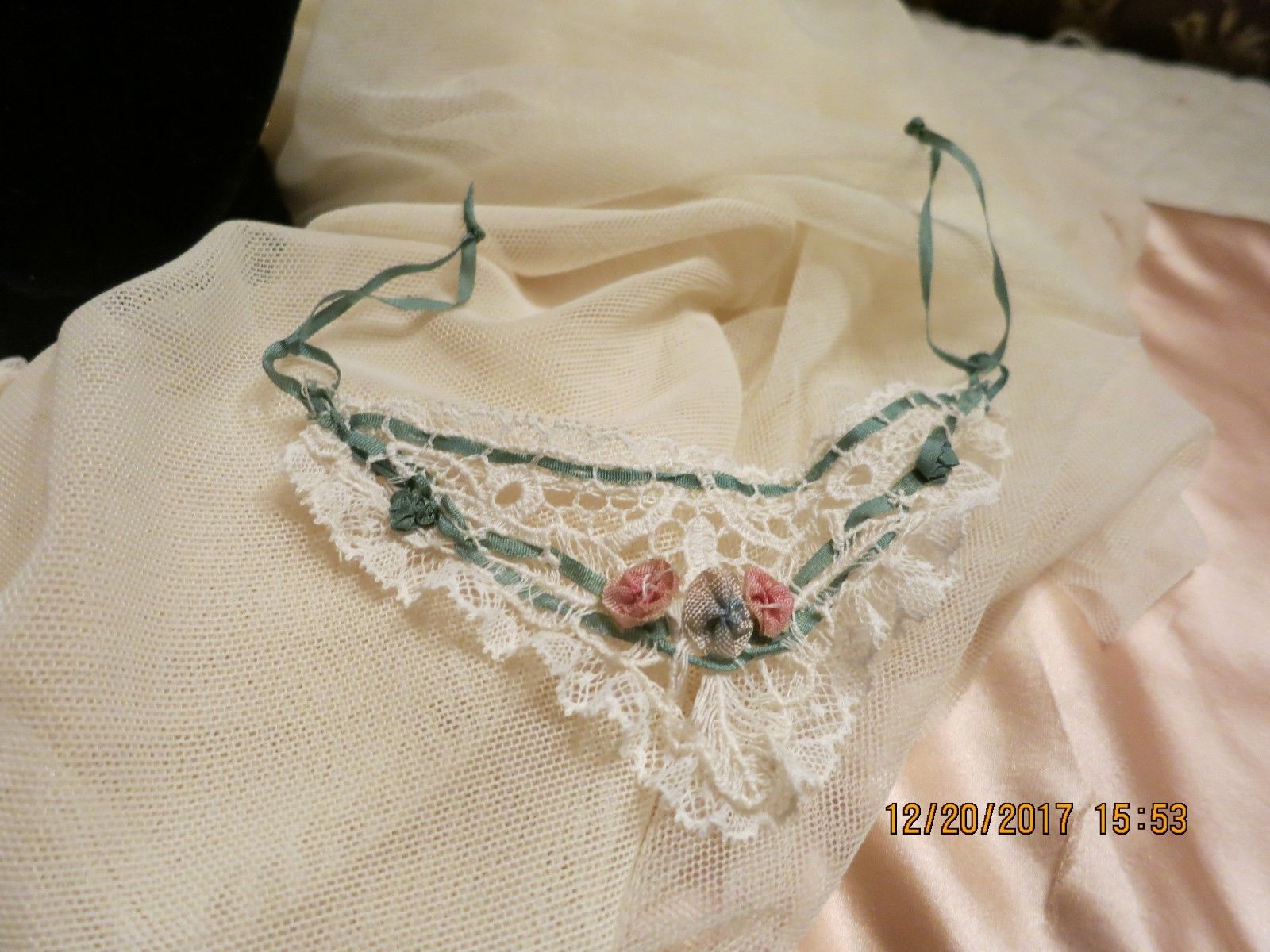 Title (ebay affiliate link): LOVELY ANTIQUE LACE COMBINED COLLAR SILK HM FRENC ROSETTE TRIM 8-10" DOLLS