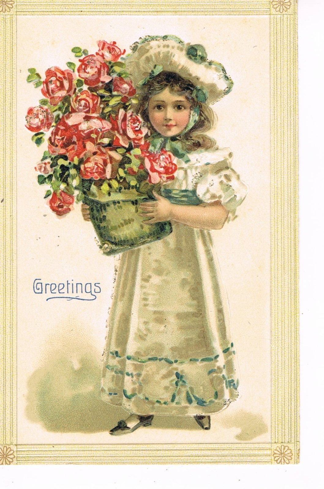 ANTIQUE EMBOSSED BIRTHDAY Postcard YOUNG GIRL, BLUE AND WHITE DRESS AND HAT